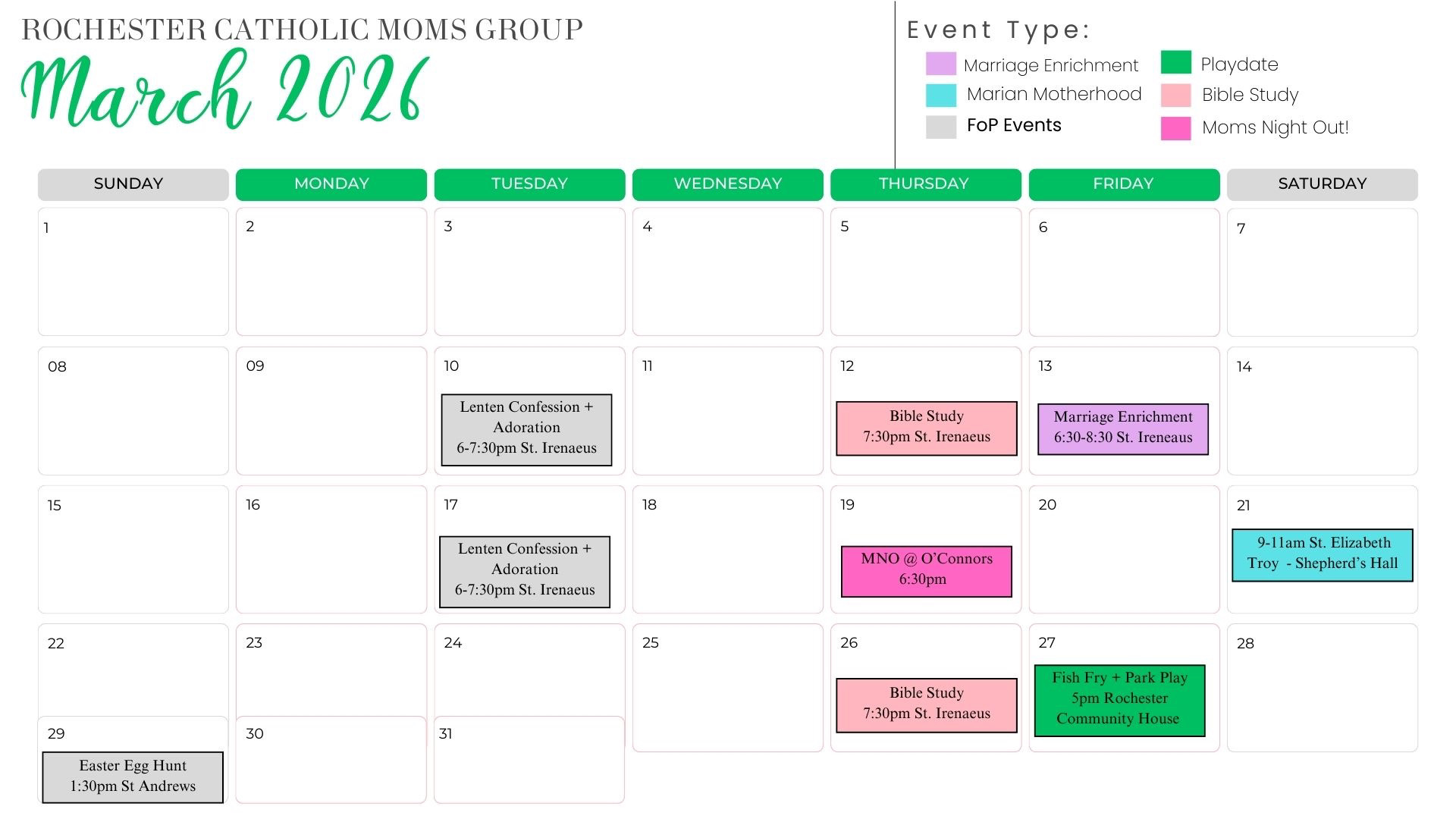 Our FoP has formed a new moms’ group! We meet weekly for story time with the kids on Fridays at 9:30am at St Andrew Catholic Church. Monthly, we enjoy a Mom’s Night Out as well as Family Dinner Night. The group is centered on our faith, values and the joy of motherhood.